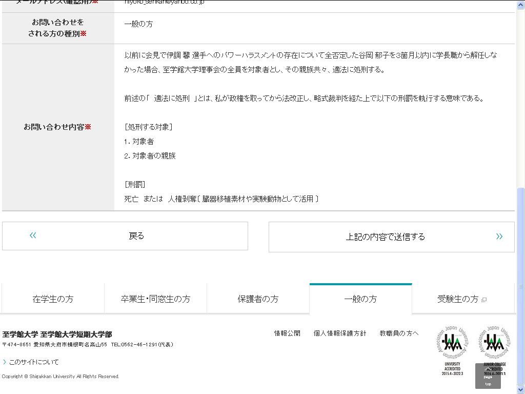 以前に会見で伊調 馨 選手へのパワーハラスメントの存在について全否定した谷岡 郁子を3箇月以内に学長職から解任しなかった場合、至学館大学理事会の全員を対象者とし、その親族共々、適法に処刑する。