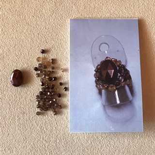 先日、ビーズタティングをした時にビーズの在庫をチェック。ビーズだけでなくキットもたくさん持っていてね。よくよく見るとヴィンテージビーズを使ったキットのビーズの細かさよ。愛知県にあるジュリアンさんというビーズ屋さんが大好きで買い集めたキットがたくさんあります。ビーズ遊びをするのに、すでに裸眼では無理。ハズキルーペの1.6倍でも小さな小さなヴィンテージビーズの穴が見えにくい。これは早々に作らなきゃ。手芸用の2倍ルーペと老眼鏡のダブル使い、手元を明るく照らせば、作業はバッチリです。まずはリングをひとつ完成。作業している間にヴィンテージビーズの表面がはげてしまい、見本とは違う色合いになったけど雰囲気がよいので、これでよし。久しぶりの雨の月曜日。テンション下がりながら出勤。今週は6連勤なのでがんばらないと。好きなビーズからエネルギーもらいます。