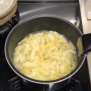 文旦の皮でジャムを作ることにしました。文旦は父が土佐の農家さんに直接頼んで送ってもらっているもので、ワックスや防腐剤は使っていないとのこと。皮がしっかりしていて、中身を食べたあとに出る皮が多くてもったいな、と思ってましたが、今までジャムは作ったことがありませんでした。実家の母が作るのを美味しく食べてましたけど。おうち時間の多い今年こそ、ジャムを買わずに作ろうっと。実を食べた後、皮をひたすら刻み、苦味を取るために水にさらしました。文旦の皮一個分だけでも2ミリくらいの幅に切るのが結構大変‥包丁はよく切れないとだめですね。たっぷりの水にいれて鍋でゆがくを2回繰り返し。最後に水にさらして一晩置く。煮詰めるのは、また明日。