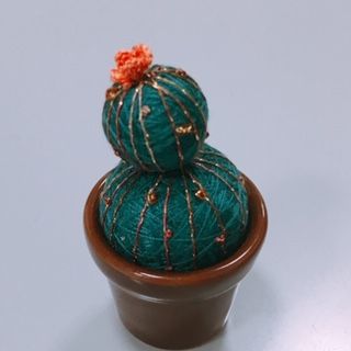 サボテンのすじとトゲトゲをラメ糸でかがり、ポイントにお花を咲かせてみましたよ。
