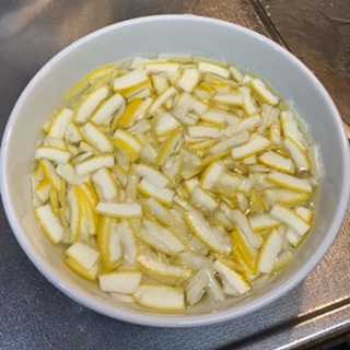実を食べた後、皮をひたすら刻み、苦味を取るために水にさらしました。