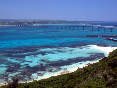 来間島の展望台から、来間島大橋を望む対岸は、ヨナマエハマビーチ。白い浜と青い海が対照的だった。