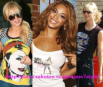 夏ファッションの基本、「Tシャツ」。 それぞれのスタイル!自分を愛してやまないパリス・ヒルトン。 アンディ・ウォーホルチックです。解散してもお友達、元デスティニーズ・チャイルドのメンバーだったケリー・ローランドのニューアルバム「Ms. Kelly」の宣伝をやってるビヨンセ。 夫SEALのTシャツを着てるハイディ・クルム。 *ハイディ・クラム *Heidi Klum「Tシャツ」を探す!ローリング・ストーンズ Rolling Stones Tシャツ☆ジェシカ・シンプソン、マライア・キャリー、フェリシティ・ハフマンブルース・ウィリスとニック・カーター(BSB)が着る土産物?アーンド漢字Tシャツ
