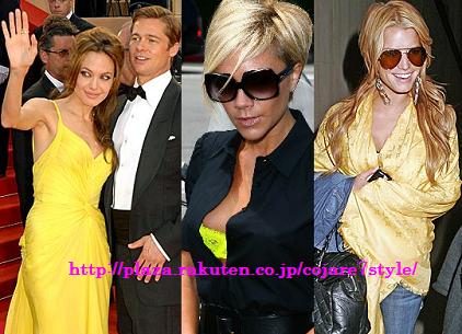 以前にもニコール・リッチーは「黄色・イエロー」ファッションがお好きで黄色・イエローファッションを取り上げたのですが、また、やります。今度は・・・・・アンジェリーナ・ジョリー ヴィクトリア・ベッカム ジェシカ・シンプソンアンジェリーナ:カンヌ国際映画祭で夫、ブラッド・ピットの出演作「オーシャンズ13」の上映会。 こんなキレイ色を着てるのって珍しいなぁと思いまして。 ヴィクトリア:「ノーブラ」じゃなかったら「見せブラ」って・・・ ジェシカ:LAの空港でパシャリ。旅にパシュミナ・ストールの類は必需品ですね。こんな高級品でなくともちゃんと役に立ってくれればOKです。