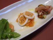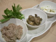 家で お料理しましたよ。こういう普通の人が外で食べる日には家で料理するのさっ(笑)。一つだけブログ用に写真を撮りました。でも、今 見てみると絵的に地味です(爆)。christmas eve。だというのに・・・。 一応 ご紹介。手前から 鶏レバーのパテ。牡蠣のマリネ(?)。クリームチーズ入り 野菜のテリーヌ。これらは、ワインが進みます!最近の食べ歩きにより、ゲットしたレシピですが、どれも美味しいぃ~。教えて欲しい人、いる(笑)?っていうか、自慢げに教えたい(爆)!!あっ、運動しよ。