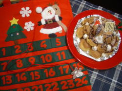 じゃじゃ~ん。私の自慢の祖母の手作りのchristmasのすごいの(笑)。 どうすごいかと申しますと、数字のところがポッケになっていてそこにチョコが入っていたのです。christmasまで毎日その日付のポッケの中のチョコを食べます。そして、25日にケーキを食べるのです!ケーキを食べるまでのワクワク感が倍増しますよね!これはイタリア土産を祖母が真似て作ったもの。25日まで、毎日誰がチョコを食べるか、ひっそりとしたバトルが うちでは繰り広げられておりました(爆)。もちろん、最初と最後は私がしっかりいただきましたぁ~!押さえるところは押さえる。それが私なのさっ(笑)。