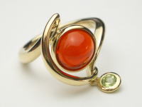 久しぶりに仕事の話をしてみよっかな~。(私は食いだおれのエグファンの人ではありません(笑)。ジュエリーデザイナーなんだよね。結構ストイックな(爆)。)リングをデザインする時、興味があるお客様には誕生日からその方にぴったりの石をお調べします。(ほとんど皆様、知りたガ~ルなんですけどね(笑)・・・。)オレンジ系が向いている方がいらして、その中でも何がいいかな~と考える前に口から「ファイア・オパール」って出ていたんですね~。本当はシトリンとかの方が探しやすいんですけど(笑)、何故かファイア・オパールだったんです。オパールは非結晶なのをご存知ですか~。固体なのに、中の構造は液体と似てるってことです。なのに、ファイア。火。すてき。そして、探しに行ったら、やっぱり出逢いました。その方のイメージぴったりの石ちゃんに。にひ。(だいたい 口から出た時点で、出逢えるなって直感するんだけどね。ほら、直感型人間だから。ぷぷ。)次はデザイン。いくつかご提案して、ご相談して・・・。今日が最終の話し合いかなぁ~と思っていた日の朝!目が覚めたら思い浮かんだデザイン!大急ぎで清書をして、お見せしたところ一発で決定しました。それが こちらです。(そうそうそう。お客様の目の前で思い浮かぶ時もあれば、こういう場合もあるんですね。私は。)柔らかい印象で、少し立体的で。これには、色々とその方から思い描くインスピレーションがあるのですが、それは、お客様と私の秘密。むふ。秘密主義な人のフリ(笑)。今日は、この話がしたくなったので、突然ブログにてご紹介です。仕事の話をどこまでブログで書くかって、私にとっては真面目になり過ぎてキャラ的に難しいのよね(汗)。