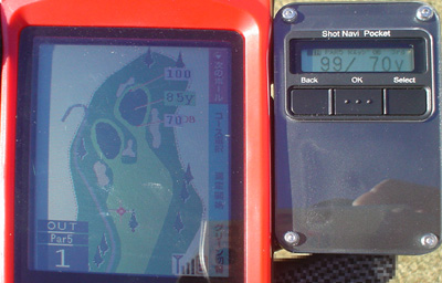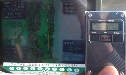 富岡ラウンドに持って行き、ShotNavi試してきました。きっとみなさんからも問い合わせがあろうかと富岡カントリークラブのカートについているナビとの違いをこれがスタートの10番ホールで確認してみた距離(ShotNaviの画像は拡大しています。)ちょっと使い始めたばかりでカートナビのピンまでの距離とShotNaviのエッジまでの距離での比較となってしまっておりますが左のピンの位置から推測するに数ヤードの違いはありますがほぼ同等と言った感じでしょうか?自分にはそう感じました。使い方は非常に簡単で3ホールほどやる中でほとんど操作を覚えられ特にセカンドでグリーンを狙うときには、ピンの位置を確認した後にエッジまでの距離とセンターまでの距離をチェックできるのでその間に打つことを考えられるのでクラブ選択には非常に重宝しました。ただ、今日の自分はショットの精度が悪く左右へのブレが大きかったために際立つ結果は得られませんでした。でも、買ってよかったと思いました。電池に関しても、1ラウンドは余裕でした。この先、充電式の電池で使っていく予定ですので心配は無いかな?と思います。まだ、書ききれないこともありますがまずは1つ「カートナビとの違い」を報告します。(^^