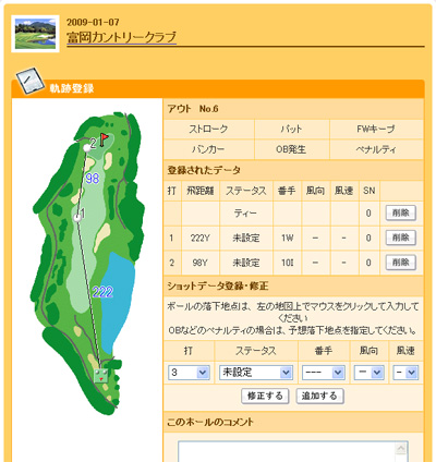 プレー日:1月8日ゴルフ場:富岡カントリークラブこの日は冬なのにとても早いスタート・・・・予約は8:00分でしたが前の組がも出たということで7:50分スタートとなってしまいました!コースは見るからに寒そう(--;このラウンドからShotNaviを使うようになって準備やルーティーンが変わる!しかも部長、副部長と業者さんの社長とのラウンドいつものペースが崩れそうです。INコース10番ティーショットを右に打ち出してしまい林の中セカンドは出すだけでサードショットも方向が悪くグリーン左のバンカーへグリーンも凍っていてパットもゴロゴロゴロゴロ・・・・。2パットではおさめられましたがダボスタート!INコース11番hiropi0084さんやひしゃぽんさんからアドバイスを受け「短いミドルはドライバーを持たないほうがいいですよ」とそれはこのホール???と思いティーショットで手にしたのは5Iその5Iで左へ打って左バンカーへ・・・・・。アイアンで打った意味無し!結局5オンに3パットまであってダブルパー!!INコース12番ティーショットをどこまでどの方向に打ってよいかわからず安全側へフェアウェーをオーバーしラフへ・・・・。そこからは出すことを主体に7Iで、3打目の5Iも届かず4オンなんとか2パットでナイスボギーだったかと思います。INコース13番ここは短め137Yのショートグリーンが硬いことを想定して短めに9Iで打ったショットも少しオーバー奥のカラーから寄せ1パットのパー なんとかパーが取れました。INコース14番279Yのミドル、ここがアドバイスのホールかも!と、思って手にしたのが4Wしかし!右に打ち出してしまいOB!(--;今日は前進ティーを選び4オンするも動揺からか3パットのトリプル・・・・。INコース15番193Yのショートホールpar3短めだろうと5Iで打ったティーショットは当たりが良く奥のバンカーまで・・・・。バンカーからは寄せきれず2パットのボギーINコース16番571Yのpar5ロング、グリーン左手前は池というローケーションティーショット、左目で左ラフにある木の手前へそこからはその木が邪魔でフェアウェイ方向に打てず刻むつもりが右ラフまで右ラフからで左に池があるので無理せずフェアウェイに置いて130Yを8Iでしかし今日はショートアイアンもまとまらず結局5オンしかもそこから3パットでトリプル・・・・。あ~もったいない。INコース17番ティーショットはまずまずでしたがやはりそこからが課題残り120Yを9Iで打つも結果はバンカー、まったく捕まえられていないんですね。そしてまたしても3パットでダボ・・・。INコース18番豪快に打ち下ろすこのホールもティーショットは良くて245Yほどでも、打ち下ろしでいい当たりでこの程度の飛距離です。(^^;セカンド、右奥に切られたカップに対してグリーンオンだけを狙って打ったショットは右に出てグリーン右の傾斜からこぼれて池へ・・・・。何やってるんだ・・・・・。結局最後もトリ。。。もう前半は最悪の内容で55(21)アイアンショットがまとまらないのと3パット続きでこのありさまです。今年は100以上を打たないようにと願っていたのに・・・・・。OUTコース1番気を入れなおして、後半戦。ここでもティーショットは良くフェアウェイ左目105Yの打ち上げに9Iを持ったのが大きすぎた・・・・。奥からの長いパットを寄せられず3パットのボギーでも、いいんですボギーで!OUTコース2番ここでもティーショットは左目、しかしラッキーなキックでボールはフェアウェイへ残り120Yを9Iでしっかり乗せ2パットでパー!OUTコース3番ピンまで140Yのショートホールエッジまで130Y、センターまで143Yまだグリーンも固めだし手前でOKと8Iで打ったショットが右目でバンカーへ、飛距離は135Yバンカーからうまく寄せ1パットでパー流れがいい!OUTコース4番513Yのロングpar5ティーショットは良く230Yほど、残り280Yですが持つのは5Iで飛距離160Y3打目は52度を持ちましたがカップにはショートでした。でも、2パットでこのホールもパーOUTコース5番レギュラーティーからのスコアカードの表示と距離はだいぶ違いました。このホールもスコアカードで187Y表示がティーグラウンドからは140Yほど短めに打つこと考えて手にしたのは8Iちょっと噛んだ感じのショットもピン左にナイスオンそこから2パットでなんとここもパーでここまで1オーバーOUTコース6番ティ-ショットは真っ直ぐバンカー方向で220Yセカンドは98YをPWで打って2オンには成功ここも2パットでと思いましたがギリギリ外してしまい3パットのボギーOUTコース7番ティーショットを左方向に打ってしまいもしかしてOB???でも、確認してみたらラッキーにもバンカー先へセカンド100YをPWで打つもちょっと右に出てしまいマウンドからのバウンドでグリーンオン距離を残したパッティング、15mもショートしませんでしたがちょっと長かった!返しをまずかボール半分外して3パットのボギーOUTコース8番ボギーペースにはかなり余裕を持ててここまでこれましたしかし、後半ティーショットは左方向に出すことが多くアウトサイドインにな