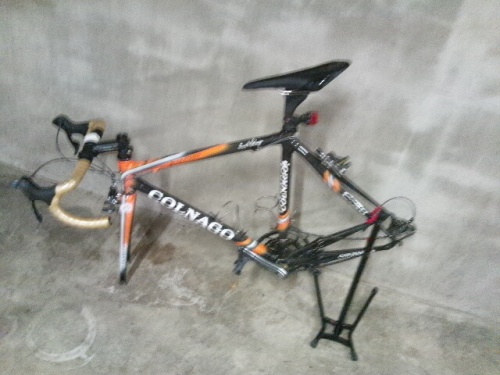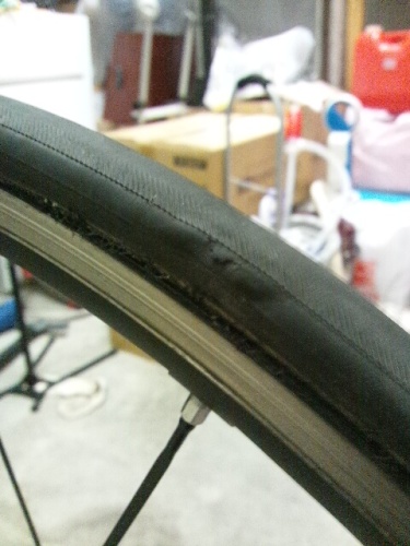 あの忌まわしい落車&骨折事件から一週間が経ちました。あと一週間はローラーも含めて、自転車を自粛してみようと思っています。(今のところ)段々余裕が出てきたのか? 事故から初めてコルナゴを見てみました。。ロードバイクにかかるダメージを体で受けとめた結果、骨折となったのか? コルナゴに目立った傷は無いようです。。でも、もちろん初めにぶつかり、パンクした前輪はダメージが見られます。まずタイヤのパンク。 チューブラーのビットリアコルサEVO-CX もう一年くらい使ったのでタイヤ交換しようと考えていた矢先のパンクですので、いい機会かもしれません。ほら、こんなささくれが出ていたほど劣化していたようです。で、この様にリム打ちパンクです。パンクに強いチューブラーもこんなに傷が広がるとどうしようもありません・・・・ホイールは・・・ 画像、パンクの下のリムを見ていただければ、ほんの少しリムが曲がっているのがわかります。。でも走りに全く影響はなさそうです。縦振れも横振れも無い様子。。そしてウェアー。パールイズミのジャケットの肩の部分がすれていました。そして私の左腕の肘はひどく擦りむいているのですが、ウェアーはほとんど肘のあたりには傷なし。ほんの少し汚れただけ・・・うーむ。意識的ではないにしろ、機材やウェアーを守りきったようです。。チューブラーのタイヤ嵌め替えないと・・・面倒だけどね。。押すべし↓にほんブログ村