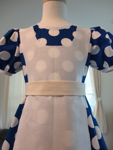 試作してみました。まだ途中ですが。試作品は110cmサイズです。Girl's D のパフスリーブドレスのパターンを使っています。身頃はウエストラインを2.0cmあげてややハイウエスト気味にしました。スカートの丈は31.5cmで、110cmサイズのスカートを、はぐ枚数を増やしました。ほぼ全円のサーキュラーになっています。このはぎ方の説明は今度書きます。ウエストのギャザーは、ミニーのはもう少し多いかもしれません。ギャザーを多くしたい方は、ワンランク上のサイズのスカートのパターンを使って、はぐ枚数を増やしてギャザーを寄せてください。この衿は掲載した身頃の衿ぐり&衿をそのまま使っています。そのままでもまぁおかしくはないけれど・・という感じですかね。ミニーのはもっと衿ぐりが深いです。衿ぐりを深くして、その衿ぐりに付ける衿の作図方法を次回載せます。テレビの映像を、後ろ姿が映った時にストップしてよく見たのですが、ミニーの衿の後ろは、こういう風にカドが丸くなっているものではなく、多分、後ろセンターで、直線で左右が分かれている衿だと思います。映る時間が「瞬間」なのと、ミニーの頭が大きくて隠れてしまっていて見えにくいので、確実ではないのですが。次回、衿ぐりをアレンジした試作品を載せます。「きっちり見積もりをしてから生地を買いに行きましょう」的なコトを本で言っておいて。生地余らせました。はい。シャバーンの生地です。で、それでこの試作品作りました。言い訳です。見積りはしました。買う時点では前身頃に見返し付けるつもりだったんです。あのローブはマントのように、前をひるがえして着る感じだと思うので、前身頃の裏側が見えても大丈夫なように作らねばと思っていました。だから前身頃と同じ大きさで、裏地のように見返し付けちゃおうかと思っていたんです。重くなるけど。でも端を青い布と縫い合わせれば縫い代を折り込めるじゃん!と生地を買ってから気が付いて。だから見返しの分、生地余りました。はい。どうでもいいですね、そんな言い訳(^^;