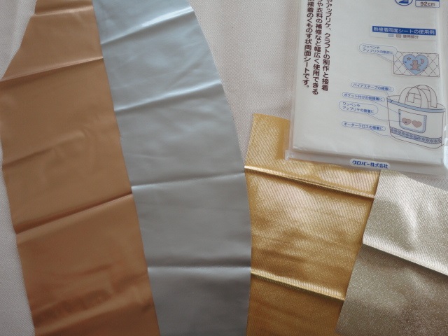 あすみんママさんへミニーの生地ですが、同じものはまず手に入らないと思うので、あの服を作るなら生地から作るしかありません。まず服を作る金色の生地は、光沢を考えるとサテンが一番手に入りやすいとは思います。いい金色があるかどうかは、探してみないと分からないですが。例のスッキリ!の画像をチェックしてみて驚きました。銀色の水玉部分以外の金色の生地は無地かと思っていたら地模様がありますね。私が本に掲載したドレスに使った生地、「ブロケード」と、模様がよく似ています。でもこの地模様が目立たないのは、もしかしたらオーガンジーのような透ける生地を重ねて使っているのかもしれません。かなり近くで見ないとこれは分からないです。いつも思うのですが、パレードやショーのキャラクターの生地ってきっとものすごく高価。一般人には手に入らない。銀色の水玉模様を作るのなら、切りっぱなしOKの生地、エナメルや合皮を丸く切り抜いて金色の無地に貼るか縫い付けて作ります。ミッキーの場合はあの模様を切り抜くワケね・・。手持ちの切りっぱなしOKの生地を撮ってみました。金色は何種類かあったのですが銀色は1種類しかなくて。これはエナメルだと思います。このテカテカ感はあまり似ていないですよね。 右2つの金色のほうは、多分合皮です。質感が似ているかなと思います。これに銀があるかどうかは分かりません。エナメルにしても合皮にしても、なるべく薄手のものがいいと思います。裏面に、アイロン接着シート(アイロン接着テープのシート版:写真右上)を貼ります。貼ってから丸く切り抜きます。剥離紙をはがして、貼りたい場所に置き、再度上からアイロンをかけて接着します。これがどの程度の耐久性があるかは保証できません。袖など、ギャザーを寄せた部分ははがれやすいかもしれません。でも、円のまわりをミシンで縫うのはものすごい手間なのと、綺麗に縫うのはテクニックも必要です。あとは生地にステンシルのように銀の丸を塗るという方法もあると思いますが、それは私は経験がないので、そういう方法の場合は詳しい方を探してください。金の布をサテンにする場合ですが、サテンは縫いにくいし、全円くらいあるスカートの裾をサテンで綺麗に折り返すのは難しいので、もしあまり洋裁経験のない方でしたらお薦めはしません。結論として30周年ミニーは柄を作ることも含めて難易度が高いです。「水玉ワンピースにしようか迷っています」というのは、赤白水玉ミニーでしょうか?赤白水玉なら木綿の生地が手に入りやすいと思うし、木綿は縫いやすいので、もしワンピースを作るのが初めてなら、そのほうがいいと思います。木綿のワンピースが出来たら、30周年にトライしてもいいのではないでしょうか。