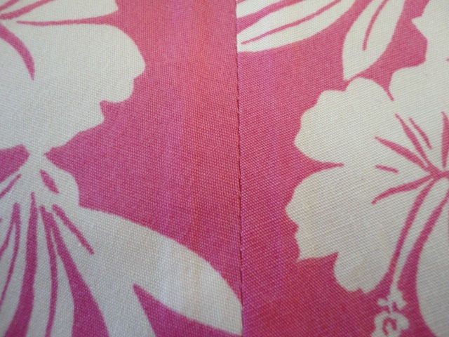 ↑なんて書くと、宝くじでも当選したか!みたいな感じですけど、違います(^^)。本にも書きましたが、洋裁用語の「アタリが出る」はいい意味ではありません。裏側からアイロンをかけた時に、表側にアイロンをかけた跡が見えてしまう状態を言います。その例が↑こちらです。これは、裾あげの時に裾の折り代全部にアイロンをのせてしまい、こういう風にいかにも「裏に折り代があります!」宣言してしまっている状態です。同じように裾を折りあげてあっても、折り目だけにアイロンをかけてあればこのように折り代の存在はほとんど感じさせない折り返しが出来ます。でも裾線が直線ならいいのですが、フレアスカートのように裾線が曲線だと折り代の幅を細めにしてあっても、折り代は波打ってしまいます。だから折り代にもアイロンをかける必要があります。そこでアイロン定規の出番です。アイロン定規は元々、このような直線の折り返しの時に、目盛りがついているので何cmを折り返すかの目安になり、端を裾線に当ててアイロンで折り返して使います。この定規の上で折り代にアイロンをかけることになるので、表側にひびきません。曲線の時の折り返しは、曲線に合わせたアイロン定規の代わりになるものを厚紙で作ってそれを当ててアイロンで折り返すという方法もあります。では、少々脱線してアイロン定規の代理の厚紙の作り方。厚紙の上にスカートの型紙の裾部分を置きます。裾線にルレットで印を付けます。厚紙の上に残ったルレットの跡を目印にして、ハサミやカッターで厚紙を切ります。裾の折り返しが1.5cmなら、切った曲線から1.5cmのところに印を付けて線を引きます。が。サーキュラースカートなら曲線はすべて同じですが、Aラインのように裾の箇所によって曲線の曲がり具合が違うと、厚紙を作るのもいちいち面倒なので私はこうやってます。アイロン台の上にスカートの裾の部分を置き、折り代の幅が1.5cmになるように測りながら折り、ピンを打っていきます。アイロン台の端から端までピンを打ち終わったら、折り線の上に当て布をしてアイロンをかけます。この部分の裾の折り返し線にアイロンをかけ終わったらピンを抜いて次の裾・・を繰り返します。裾の折り返し線に全部アイロンをかけたら、今度は裾の折り代の間にアイロン定規をはさみ込んで折り代にアイロンをかけ、波打っている折り代を落ち着かせます。アイロンをかけ終わったら、ミシンで縫うかまつり縫いをします。ちなみに。下の110cmサイズの黄色のワンピの生地のように、黄色と白なら裾あげの糸は黄色を使って白い模様のところを縫ってもそれほど糸は目立たないのですが、その下の80cmサイズのピンクのワンピの生地のように地の色が濃いめで模様が白抜きの場合。裾あげのミシンの糸の色、何色にするか困っちゃいますよね。地のピンクの部分に白い糸のミシン目があっても、白いお花や葉っぱの部分にピンクの糸の縫い目が通っても、なんだかなぁ・・。透明糸はできれば使いたくないし。(糸端がチクチクするから子供服にはあんまりね・・。)糸の色なんて気にならないならいいんです。気にしないほうがラク(^^)黄色のワンピの裾あげはミシン縫いです。ピンクのワンピは手縫いでまつってあります。手縫いなら、縫いたくないところは避けて縫えますから。表になるべく縫い目が出ないように、裏から「すくい縫い」です。生地の表面(ひょうめん)の糸を1本か2本だけすくってまつり縫いします。ちょっと根気がいる作業です。このワンピはサイズも小さいし裾まわりの長さが短いからまぁ、そんなに時間はかかりませんが。大きいサイズのフレアスカートの裾あげを手縫いのまつり縫いでするのは時間と根気が必要です。写真は、見えやすいように表面(おもてめん)にすくい縫いのように針を入れて撮ったものです。まつり縫いした裾を表側から見たところ。糸は薄いピンクを使っています。白い花の中にポツポツと見えるのがまつり縫いの縫い目です。目立たないでしょー(^^)v♪きゃ~♪1日に2回も更新しちゃった~~♪