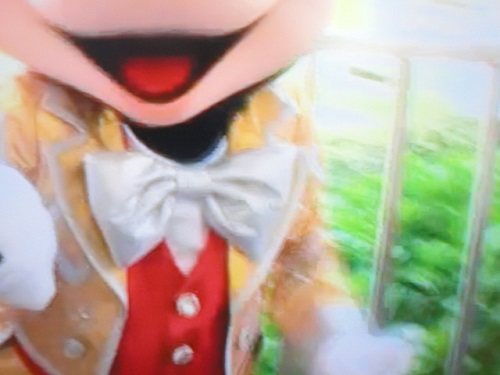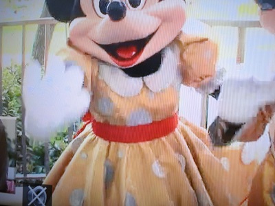 30周年ミニーのワンピの作り方を説明したら、ミッキーの衣装もアレンジ方法を書いておかなければ片手落ちというモノでしょう。「自称・キャラクター衣装研究家」としては。(↑オカダヤ町田店さんで、著書紹介のパネルを作っていただいた時、お客様に対してキャッチーなコピーが必要だったので、恥ずかしながらこんなフレーズを入れてもらいました。「作ったディズニーキャラクター衣装は300点以上」も、自分でHPのアルバムページを見ながら数えました(^^;一体何着作ったのか自分でも分からなかったので。)アレンジ方法の掲載ページはこちら。http://www1.ttcn.ne.jp/~kaori/lapel.html「スッキリ!」の、例の阿部レポーターのミキミニ映像をストップモーションにして衿がよく映ったところをカメラで撮りました。ストップにすると画面が粗くなってしまうので、鮮明な画像じゃなくてごめんなさい。でもパレードの画像だとなかなか衿もとまでちゃんと写らないですよね。衿の形は確認していただけると思います。衿とラペルの間のきざみ(P.17に図があります)の角度は、大体50°位でした。30周年ミッキーのベストの裾は、エントランスの黒ジャケ赤パンミッキーのベストよりも、裾の角度がゆるめのようです。Boy's A のベストは、エントランスミッキーのベストをモデルにしています。エントランスミッキーのベストの裾の角度は大体103°位。30周年ミッキーのベストの裾は120°位だと思います。テレビの映像を止めたり、今月のTodayの表紙の写真を測ってみました。(キャラクターの衣装を真似する時は分度器を結構使います。私だけかしら?お子さんが小学校以上ならご家庭にあるかな。今は100均でも三角定規とセットで売っています。)このドレスコートの試作品は、本に掲載するアイボリーのドレスコートを作る前の試作品です。もう2年半も前に作ったものですが、「何かの役に立つかも」と思ってとっておいて良かった。ピークトラペルのとがったラペルの先を折り込んであります。大体、このくらいの角度で30周年ミッキーの衿に似るのでは。ナゾの「A」の文字が何を意味するのか、今となっては自分でも分からない。Boy's A のAかしら。この文字が書いてあるところを「ラペル」と呼びます。本当はラペルだけでなく、表衿と裏衿の大きさも少々変えたほうがいいと思うのですが、それはまた複雑な説明になるので省きます。出来る方はトライしてくださいね。ランド・エントランスやシープラザのグリーティング衣装を30周年にするのかと思ったらノーマルなようですね。30周年衣装が並んで撮れるキャラクターじゃないのなら、衿も完コピじゃなくていっかー(^^)?
