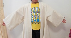 よくネット上で、「ドコドコの子供用パターンは細身でピチピチ」とか「ドコソコの大人用パターンはぶかぶか」とかいう噂話を目にします。ま、言わずと知れた2ちゃんですが(^^)。おそらく、パターンに記載されたB・W・Hとほぼ同じ寸法の体型の人、または子供にそのパターンを使った服を作って着せたとしても、ぴったり過ぎたりゆる過ぎたりするのだと思います。ゆるめならまだしも、ぴったり過ぎて、せっかく作ったのに子供がキツいからと嫌がってほとんど着てくれなかったりしたら悲しいですよね。大人はともかく、子供服は90cmとか110cmとか、身長でサイズが分かれていて、見た目にすごくヤセているとか結構ぽっちゃりとかいうお子さんでなければ、大抵の方は「ウチの子は標準体型」だと思っていて、わざわざ採寸なんてしないのかもしれません。普段着ならそれでもまぁいいのですが、衣装はやっぱりちゃんと採寸してお子さんの体型に合わせて作ってほしいなと思います。そのほうが可愛いし、カッコいい。すぐ着られなくなってしまったとしても。「ピチピチ」や「ユルユル」は、借り物感、お下がり感が否めない(^^)。本のモデルさんもしてくれて、今回のアシームとシャバーンを着てくれた双子ちゃんは、私の家から決して近いとは言えないところに住んでいます。服を作っている途中で「ちょっとコレ着てみて」は出来ません。その双子ちゃんにサイズぴったりの服を作れるのは、ママさんのご協力のたまもの。本のP.2に掲載の「測りドコロ」(B・W・Hだけでなく、肩幅、背肩丈、袖丈・・と10項目以上)をすべて測っていただいています。2人分なので、測るだけでも大変だと思います。今回のアシームとシャバーンは、シャツとパンツくらいなら採寸だけでモデルさんに合った服が作れると思ったのですが、シャバーンのローブだけはちょっと心配。特に丈が。なので試作品を作り、双子ちゃん宅に送って着てもらい、ママさんに前正面、後ろ正面と手を広げた状態(上の写真)を撮って画像を送ってもらいました。心配した着丈は大丈夫だったのですが、写真のように少し袖が長め。この試作品より2cm袖丈を短くして、あの作品が出来ました。この場を借りてあらためてお礼を言います。私の作品があるのは、双子ちゃんママの採寸と写真撮りあってこそです。いつもありがとうございます。「せっかく作ったら来年も着せたい」というお気持ちも分かるし、「たかが趣味なんだからそんなコト気にしない」という方は、私の言うコトなんて無視してくださいまし~~♪