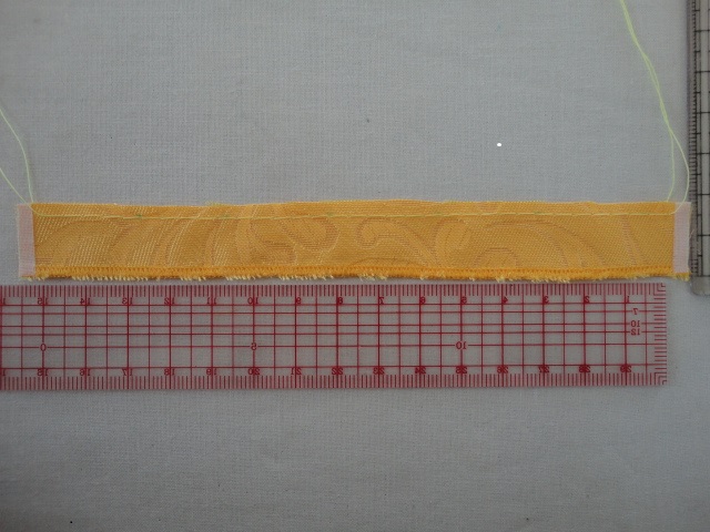 出来上がり寸法:1.5cm幅×長さ15.0cm 縫い代を付けて1.8cm幅×長さ16.0cmの布を用意する。この生地はほつれやすいので、脇に伸び止めテープを貼ってあります。巻きロックで端の処理をする。ロックミシンがない場合は縫い代を増やし、端を0.3~0.5cm折り返して端ミシンをかける。(端ミシンは、脇をナカオモテで縫い合わせた後のほうが綺麗です。)反対側の端から0.3cmのところにギャザー寄せミシンをかける。※脇を揃えて、ナカオモテで布端から0.5cmのところを縫う。※ギャザー寄せミシンは、輪の状態にする前に縫ったほうが縫いやすいですが、輪にしてからのほうが縫い代も一緒に縫えるので、縫いしぼるのはやりやすいです。写真は、先にギャザー寄せミシンをかけてから輪にした方法です。縫い代をひらき、縫い目にアイロンをかける。ギャザー寄せミシンを引きしぼり、寄せたギャザーがゆるまないように裏側の縫い代を数箇所縫い留める。表側にラインストーンを付ける。ゴムは約16cmにカットする。結び目を作り、花の裏側に縫い付ける。ご希望の方にお送りしておりますシェリーメイのキャミソールドレスの型紙ですが、「ベルっぽいドレス」として作った服のスカートは5枚はぎで、ウエストに少しギャザーを寄せる仕様です。このスカートの枚数を増やして、同じパターンを7枚はぎで作ってギャザーを多めに寄せたらどんな感じかしらと試作品を作ってみました。スカートのみの試作です。7枚はぎにすると、ほぼ4/4のサーキュラーにギャザーを寄せたスカートになります。ウエストはV字ラインではなくノーマルです。スカートの脇のラインをお見せしたいから、シェリちゃんちょっと手を上げててね(^^)パターンの脇線に少し丸みを付けました。このポーズと、耳飾りを付けているせいもあって、ちょっとフラっぽいですね。アロハっぽい柄があれば、それで作ると可愛いかも。