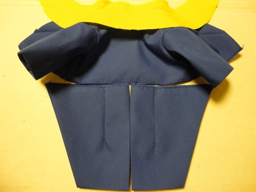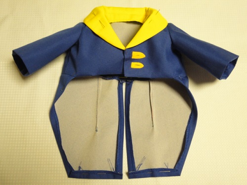 ここまでしか出来なかったわー。この青い生地は先日作ったシャバーンのローブの前&裾&袖口に使った布です。生地全体に接着芯を貼ってから裁断したので、接着芯を貼った余り布が残っていました。ぬいぐるみの服でもジャケットは接着芯を貼ったほうがシャキンっとするので、そのまま使いましたが、問題は燕尾服って裏が見えてしまうことなんですよね。でも裏地無しの作り方の写真撮りをしたかったので、裏地無しで作りました。写真撮りが終わったら、燕尾の部分だけでも裏地を付けようかと思っています。あとは全体を濃い黄色のバイアステープで縁取りしてカフスを付けるだけなんだけど。あとボタン買いに行かなきゃ~~。ついでにドールスタンドもう一個買おうかな。あ、なんかダーツの長さが違う(^^; 直そ。