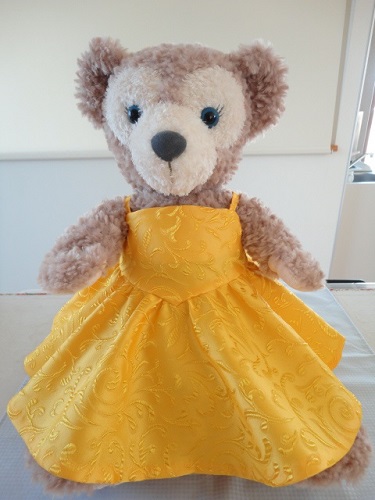 ベルは髪を頭の上でオダンゴ状に盛り上げて、そこに巻きバラの飾りを付けているのですが、シェリーメイにはそんなモノは無いし、ドレスの胸元に巻きバラがあるので、頭にも付けると飾りが多くてバランスが悪いかなと思って、耳に小さな飾りを付けることにしました。ゴム紐で耳に留めてあるので、イヤリングという感じではないから「耳飾り」(^^)ドレスの共布を細く切って巻きロックで端を処理して縫い絞り、お花のような形にしました。中心にはラインストーンを縫いつけ、シェリーメイ色の細いゴムを裏に付けて耳にはめられるようにしました。こういうの付けるとシェリちゃんちょっと色気出ますね(^^)・ドレープ衿の寸法本のP.36 右下のドレープ衿の作り方を参照してください。16×22(伸びる方向)cmナカオモテでヨコに縫って表に返し、7cm幅の筒状のものを作ります。上の端は中心から左右に7cmずつ、下の端は中心から左右に10cmずつを測り、ピンを立てます。ピンとピンを直線で結んで印をつけます。この直線にギャザー寄せミシンをかけます。あとはmixiアルバム(子供服のドレープ衿)を参照してください。http://photo.mixi.jp/view_album.pl?album_id=500000081779518&owner_id=47314531・巻きバラの寸法P.38 中段やや上の花びらの作り方を参照してください。3×28cm 可能であればバイアスで取る。薄い芯を貼った生地をナカオモテでヨコに二つ折りにして、丸みをつけてミシンで縫う。表に返して形を整え、ギャザー寄せミシンをかけて14cmに縫い縮める。これもmixiアルバムの写真図解を予定しております。少々お時間くださいませ。・巻きバラのガクの寸法1辺(花びらの先から先まで)約5.5cm 本に掲載した子供服用のガクの型紙を60%に縮小して、真ん中(5cm用)のガクを使用してください。オーガンジーをナカオモテで2枚合わせ、返し口を残してミシンで細かく縫う。縫い代をカットして表に返し、返し口を縫う。(ミシンでも手縫いでもOKです。)ガクの形が出来たら直径2.0cmの円をぐし縫いする。花びらの裏にかぶせてまつる。mixiのダッフィーコミュに久しぶりに書き込みしたので、再度型紙のご紹介を書いておきます。シェリーメイ用のキャミソールドレスの型紙と、ダッフィー用のショールカラーのドレスコート(燕尾服)の型紙を差し上げます。ダッフィーの衣装はほとんど出来てはいるのですが未完成なので、また写真を撮りなおします。完成ではないですが、下のほうに写真を載せてありますのでご覧くださいませ。ショールカラーの燕尾服は、後ろ身頃・燕尾・袖の型紙は本に掲載の型紙と兼用です。お送りするのは前身頃、裏衿、表衿、見返し、カフスの型紙です。本を買ってくださった方でメールで感想を書いてくださった方に限らせていただきますね。ご意見聞かせていただきたいので・・。楽天やamazonでレビューを書いてくださった方、このブログに感想をコメントで書いてくださった方は無条件で。どうぞご連絡くださいませ。以前、他の型紙を差し上げた方も勿論OKです。 coly@mx1.ttcn.ne.jpメールに圧縮で画像を添付してお送りします。ご家庭でA4サイズにプリントアウトしてお使いくださいませ。本を買ってくださった方には、これからもぬいぐるみ用の新しい型紙が出来たら差し上げたいと思います。本を買ってくださったことへの、少しでもお礼になれば。