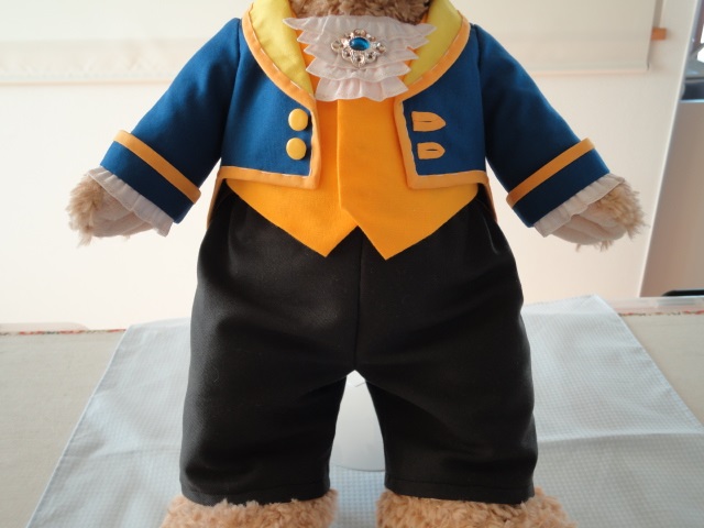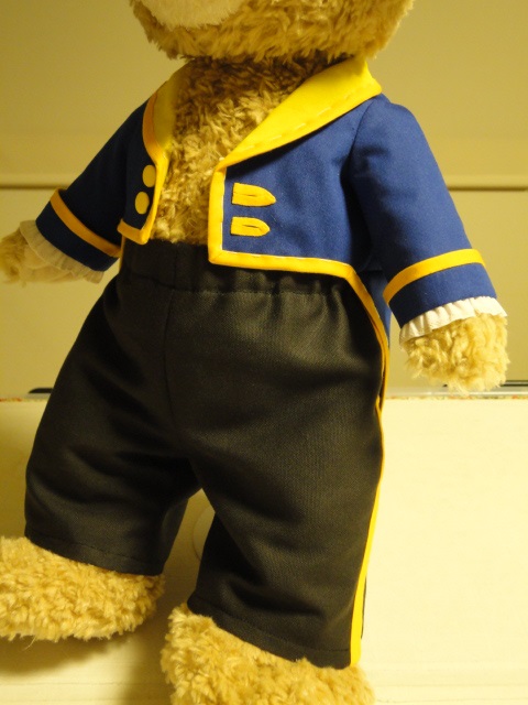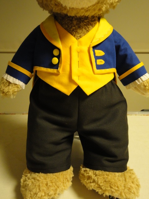 まだ途中ですが、ただいまダッフィー用のショールカラーのドレスコートを作っています。夜撮ると変な色だけど、青ジャケットに黄色い衿。「美女と野獣」のビーストの燕尾服です。シェリーがベルならダッフィーはビーストよね♪これもmixiに写真図解を載せる予定です。子供用のショールカラーのドレスコートは、本に実物大型紙を載せておりますので、子供服を作る時にも参考にしていただけると思います。