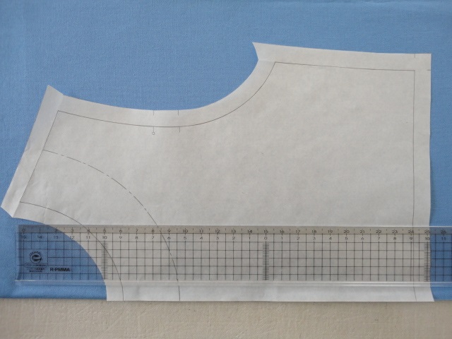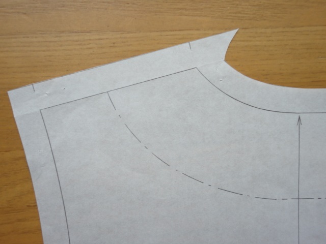 久しぶりにmixiアルバムを更新しました。アルバムのタイトルは「型紙の写し方・縫い代の付け方・裁断の仕方・直線の縫い合わせ」。http://photo.mixi.jp/view_album.pl?album_id=500000083800789&owner_id=47314531縫うことばかり説明していたけれど、mayseaさんからのご質問で、その前の段階もちゃんと写真で載せておいたほうがいいと気が付きました。mayseaさん、ありがとうございました。mixiアルバムでは約40枚の写真で説明を載せましたが、mixiに加入していない方もいらっしゃると思います。でも是非見ていただきたい内容なので、かいつまんでココにも載せます。写真図解の中には「Dカーブルーラー」が登場します。本にも書きましたが、型紙の曲線を描く時はDカーブルーラーがあると綺麗な線を引けます。1100円前後と定規にしては高価なので、是非にとは言えませんが、綺麗な線を描くためにはあるととても便利です。型紙を広げる。折り線が付いているのでアイロンをかけた方が写しやすい。写す型紙の線に印を付ける。輪にする線に、写す紙の端をそろえて置く。輪にする線には縫い代が必要ないので紙の端の直線を合わせる。動かないようにペーパーウエイト等で押さえる。「貼ってはがせるテープ」で貼ってもいいです。直線は定規で線を引く。曲線はDカーブルーラーがお薦め。布目線、見返し線、合い印も忘れずに。前身頃の中心が輪の場合、中心線が布目になるので、布目線は書かなくても大丈夫です。(実は書き入れるの忘れて写真撮りました。スミマセン。)直線部分の縫い代の幅が1.0cmの場合、線から垂直に1.0cmのところに2~3箇所、印を付ける。直線部分の1.0cm幅の縫い代。長めに引いておく。曲線部分の縫い代。幅1.0cmの場合、同様に線から垂直に1.0cmのところに印を付ける。直線よりこまめに。印にDカーブルーラーの曲線を合わせて線を引く。衿ぐり曲線の1.0cm幅の縫い代。カドはつなげなくていい。合い印やギャザー止まりの印は、曲線に垂直に定規を当てて、縫い代の端に0.3~0.4cmの長さの印を付ける。縫い代線をハサミで切る。カドはあとから切るので、大きめに切っておく。肩の出来上がり線で紙を折る。折った状態のまま衿ぐりと袖ぐりの縫い代線をハサミで切る。縫い代線を切った状態。ひらくと、カドの縫い代線も出来上がり。脇の出来上がり線で紙を折る。折った状態のまま袖ぐりの縫い代線をハサミで切る。縫い代線を切った状態。ひらくと、カドの縫い代線も出来上がり。肩線に垂直にして、肩先と衿ぐりのカドに合い印を付けておくと縫い合わせの時に前後の肩が合わせやすい。同じく脇線に垂直にして、カドに合い印を付けておくと縫い合わせの時に前後の脇が合わせやすい。前身頃の型紙の完成。服の名称、パーツの名前、サイズも記入しておく。後ろ身頃の型紙。前身頃とやり方は同じ。違うところは、後ろ中心に1.5cm幅の縫い代を付けること。