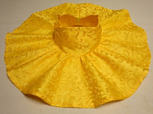 また昼間に写真を撮りそびれてしまいました。なので着用画像は次回とさせていただきます。スカート広げて置いて撮ってみました。サーキュラーにちょこっとギャザーを寄せると綺麗な形のスカートになりますね。30周年ミニーの試作品を作ってみての発見です。で。前々回くらいに「肩ヒモのドレスなら簡単だし」なんて書きましたが、なかなかどうして。肩ヒモが短かすぎるんですわ、ぬいぐるみの服だと。だから見返しに肩ヒモを挟み込んで身頃と見返しを縫い合わせするのがやりにくい。これなら子供服のほうがラクかもしれない。肩ヒモを挟み込むのを前身頃だけにして、後ろはスナップ留めとかにしたほうが作りやすいかもしれないですね。それか、前身頃と後ろ身頃に別々のリボンを挟み込んでおいて着せてから肩で蝶結びにするとか。ともかく、シンプルだから色々と変化させられますよ♪