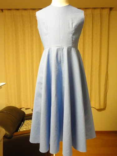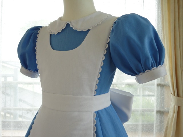 ほぼ出来てきましたが、パフスリーブがカフスの重みで下に垂れさがってしまいがちなので、袖山布を付けることにします。あとは衿ぐりの星止めと裾始末かな。明日また写真を撮りなおしますね。色もこれじゃよく分からないし。アリスのワンピースに使った生地は、「幅広シーチング」。90cm幅のものが多いシーチングですが、110cm幅のものもあります。この幅は嬉しいのですが、難は2つ折りで巻かれて売られていること。本にも書いたのですが、この2つ折りで巻かれて売られている生地の「輪」を、服の中心に使う事はNGです。いくらアイロンをかけても、この折り目が完全に取れることはないからです。でも子供服とはいえ、ドレスのスカートは幅が広くなっているので、110cmの幅いっぱいにスカートを裁断する必要があります。身頃の前中心は「輪」以外の部分を輪にして取ればいいのですが、スカートの前中心はこの「輪」を使うことになってしまいます。これは出来れば避けたい事なので、生地を買う時にこれにしようかどうか迷いました。でもアリスに似たいい色で、あまりペラペラに薄すぎない生地が、2つ折りでない木綿生地のなかにはありませんでした。アリスのスカートの前中心は上から2/3くらいまではエプロンで隠れるし、今回は色を優先して目をつぶろうと思って、この生地に決めました。このシーチングは薄手ではあるのですが、そんなに「ペラペラ」ではなかったので、ワンピースでも「透け」感もなさそうで大丈夫かなと。普通の水色に見えるアリスの服ですが、意外と色を見つけるのが難しいんです。ランドでアリスと並ぶと「ああー、違う~。」ということ多いと思います。私は今回2ショット狙いで作ったワケではないので、それほどこだわって探してはいないのですが、お子さん用だけでなくハロウィーンで仮装する大人の方も、アリスのワンピースを作る方は多いと思います。もし「この生地がアリスにちょうど良かったよ!」「並んでも遜色なかった。」という方がいらっしゃいましたら情報くださいね。他の方の参考になると思いますので。ちなみに。ハロウィーンの仮装期間、9月中旬はグリーティングのアリスは半袖のパフスリーブワンピですが、10月下旬の仮装期間のグリーティングでは、長袖ワンピの可能性があります。これは多分、その日のお天気とか気温により、だと思うのですが、長袖ワンピは少し起毛っぽい素材の生地を使っていて、半袖ワンピとは色合いも少し違ってきます。お子さんにアリス服を作る場合、「半袖作って行ったらアリスは長袖でがっかり」ということのないように、半袖か長袖かが明確に分かる季節に行ったほうが良さそうですね。(あ、こんなコト、こだわらないならいいんです。私の発言は相変わらずマニアック過ぎますので無視してください(^^;☆)
