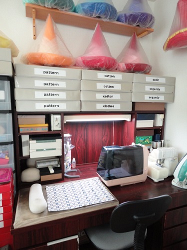 私が普段ミシンをかけている机は、棚が付いた学習机よりもひと回り大きい、私専用の机です。これは主人の亡くなった父が使っていた机で、ローズウッドの重厚な作りは「博士の机」の趣き。収納力がかなりあります。 (あ、主人の父は博士じゃないです。念のため(^^;☆)ガタもきてます。左下に貼ってあるのはビニールテープ。補修してあります。作業スペースも大きめなので、ミシン、ロックミシン、アイロン、大きめのアイロン台が全部のっています。アイロン台は年季入りすぎて焼けたような色で恥ずかしいのでマット置きました。私はこの机の正面に座ったまま、直線縫いの時はミシンを手前に引き寄せ、ロックミシンを使いたいときは、普通のミシンを奥に押してロックミシンを手前に引き寄せます。この時、便利なのが「カグスベール」(^^) 家具の足に貼り付けて、例えば掃除の時などに家具を動かしやすくするものです。これをミシンの裏面につけてあると便利!いちいち重いミシンを持ちあげなくても、すべらせるだけでミシンの移動が出来ます。ミシンとロックミシンを使い分けるというだけじゃなくて、限られたスペースでミシンをかけて次にアイロン・・という時も、ミシンを動かす時にやりやすいと思います。ただ、すべりやすくなっているので勢いよくミシンをかけていると、ミシンの振動で少し動いてしまいます。私のミシンは重いので気にならない程度ですが、軽いミシンだと動きやすいかな?まぁ、やってみてNGだったらすぐ剝がせるものでもありますし。カグスベール、お試しあれ♪今日はアリスのワンピース始めました♪ (冷やし中華始めました~♪)amazonに書いてくださった方へyossitchさん「私も頑張ろうという気にさせる一冊」、とてもとても素敵なレビュー、ありがとうございます!「ディズニーコスチューム界のカリスマ」はちょっと・・(^^;;; 謹んでご辞退させていただきますわ・・(^^)。 でもそんな風に言ってくださって、お気持ちとても嬉しいです。他のソーイング本には書いていないことを詳しく説明してあるって書いてくださって、光栄です。型紙、「直せばいいんだ!」って、我が意を得たりという感じです。嬉しいわ~~♪ >>市販されているパターンで自分の作りたいものにドンピシャなものってないんです。そうだと思います。近いものを見つけただけでもラッキー、ですよね。以前も書いたんですが、アレンジしたり、型紙のサイズ補正をしたりすることに臆病にならずに、まずやってみて欲しいなと思います。おっしゃる通りせっかく作るんですから「本当に欲しい1着」にして欲しいです。 >>本当は皆が知りたいと思っていたことまで書けるのは自費出版だからこそ出来る・・ありがとうございます。「Colyさんのこだわりが随所に感じられ・・。」と書いてくださったのもすごく嬉しいです。カラーの少ない、文字ぎっしりの本にそんな風に言ってくださる方は、ソーイングが好きで、いいものを作りたいと思ってらっしゃる方ですよね。 yossitchさん(とmayseaさんが同じ方なんですね。)の服作りのお役に立てますように♪ありがとうございました!続けて、コメントのmayseaさんへご購入くださって、そしてamazonのレビューを書いてくださってありがとうございました。25周年ミニー、ピッタリの布を見つけたなんて相当ラッキーですよ!みなさん苦労してたから。地元の神戸のお祭り、一昨日だったんですね。プルートが気が付いて「ミニーだね」ってしてくれたんですか? 良かったですね~~♪夏にパークへ行くお友達に30周年ミッキーを作るんですね。「ミッキーは一度は作ってみたい」、分かります。30周年ミニーを作った経験を生かして、ミッキー服の柄作り、頑張ってくださいね。 >>基本的なことで申し訳ないのですが、型紙を写す方法を教えていただけませんか?池上さん風に言えば「いい質問ですね!」 今まで縫い方ばかり写真図解していたけれど、その前の段階も写真でお見せしたほうが分かりやすいですね。なるべく早くページ作ります。 >>今まで当然のように両面チャコペーパーで型紙をとっていました。私もチャコペーパーで印付けをするのがNGだって、オープンカレッジで知って愕然としました。縫い代付きの型紙の作り方もオープンカレッジで教わりました。裁断するのも縫うのもすごくラクになりましたよ。「縫い代付型紙なら印つけがほとんどいらない」をご説明しますね。本のパターンを広げて上に紙を置いて、出来上がり線(仕上がり線)を写し取りますよね。そうしたらもうパターンはとじていいですから、紙の出来上がり線のまわりに縫い代を書いていきます。まあ大抵はまわりに1.0cm幅か1.5cm幅の線を書けばいいんです。次にその縫い代の線をハサミで切って、型紙が出来上がります。その型紙を布の上に置いて、私の場合はシルクピンで型紙を布に留めます。布を裁断します。ロータリーカッターを使う方は、マットの上に布を置いて型紙をのせ、ピンで留
