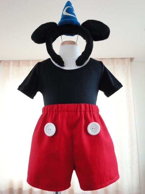 80cmサイズで、ミッキーパンツとミニースカートを作ってみました。ボタンはまだ両面テープで貼っただけですが。 パンツは本に掲載のハーフパンツの型紙の丈を少し短くしたもの。スカートは型紙無しで、長方形の布を2枚縫い合わせたものです。多分これが一番簡単なキャラクター服ですね。洋裁初めての方はまずこれからトライしてはいかがでしょうか。実際、私は1日で両方作りました。作り慣れているとはいえ、撮影しながらなので普通よりは時間がかかります。でも1~2日あれば充分、ペアものが作れる♪パークで売っている青の三角帽子のついたカチューシャ、水玉リボンのカチューシャと合わせ、これから暑い季節のインパークでは、半袖の黒いTシャツと組み合わせて、兄妹、姉弟でミキミニのペアはいかがでしょうか。1人よりずっと目立ちますよ~(^^)今度は黒Tシャツと一緒に着用画像を撮りますね。