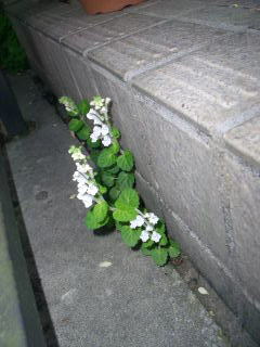我が家の玄関です。玄関前のコンクリートのすき間からこんな可愛い白い花が咲きました。 あたりを見回すと、あちこちに、こぼれ種で咲いていました。小さな庭に思いがけない 落し物…雑草だけど、小さくてキレイなお花にうれしくなりました。ところどころ あちこちに
