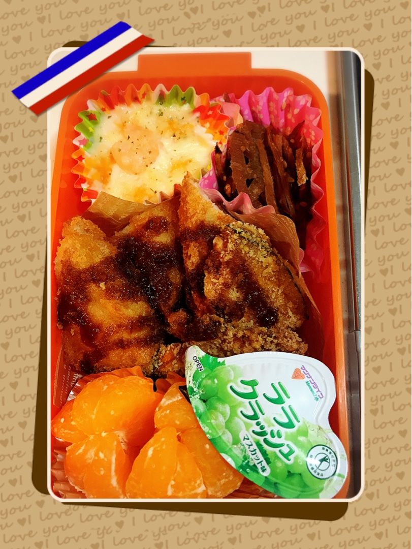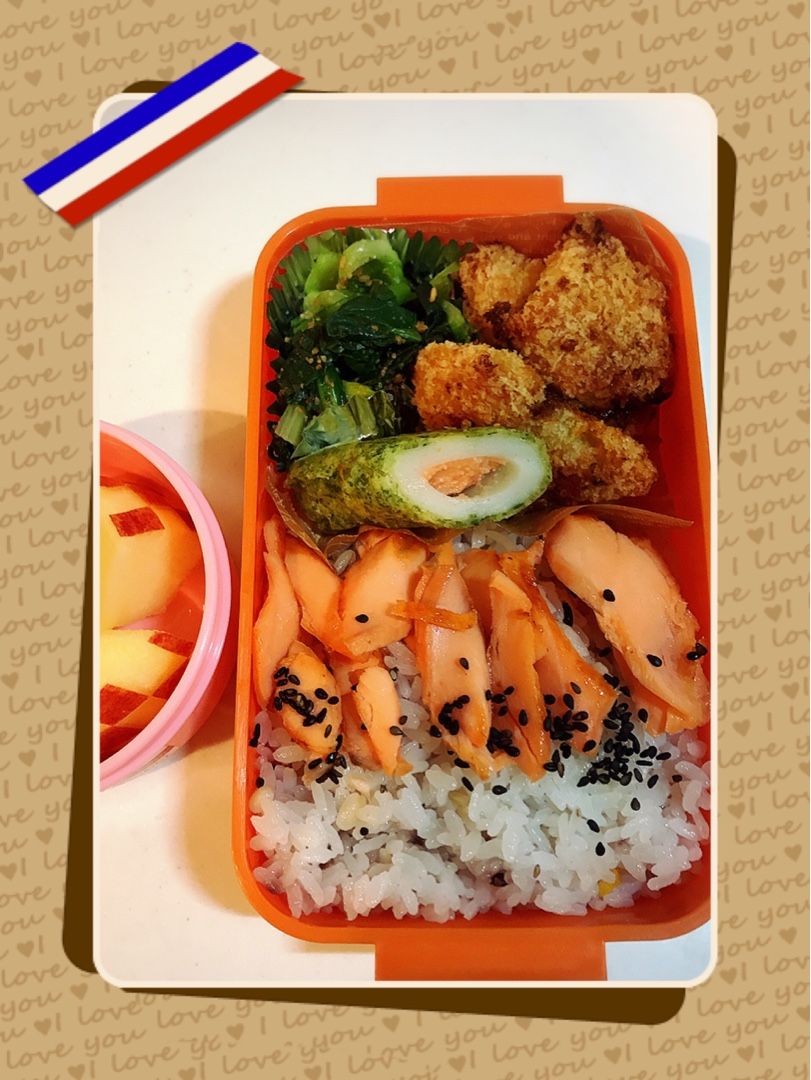 焼き鮭とチキンカツ弁当 小松菜の胡麻和えとちくわの明太磯辺揚げ 格子柄りんご🍎 おかず半分になったので随分と楽になりました。 ⁂週末の晩御飯⁂ 金曜は、うな丼に揚げ出し餅と茶碗蒸し 土曜は、鶏肉の唐揚げ 日曜は、ミートソーススパゲティ ⁂彼に持たせた平日晩御飯おかず⁂ 冷食カツ丼、マグロ丼、豚の角煮 キーマカレー、焼き鮭、ラザニア、味付き卵 手作りは、キーマカレーと焼き鮭のみ。 プラスおにぎり10個と冷凍ご飯4パック こんな日もある。 そんな冷凍できるものばっか作らないしね。