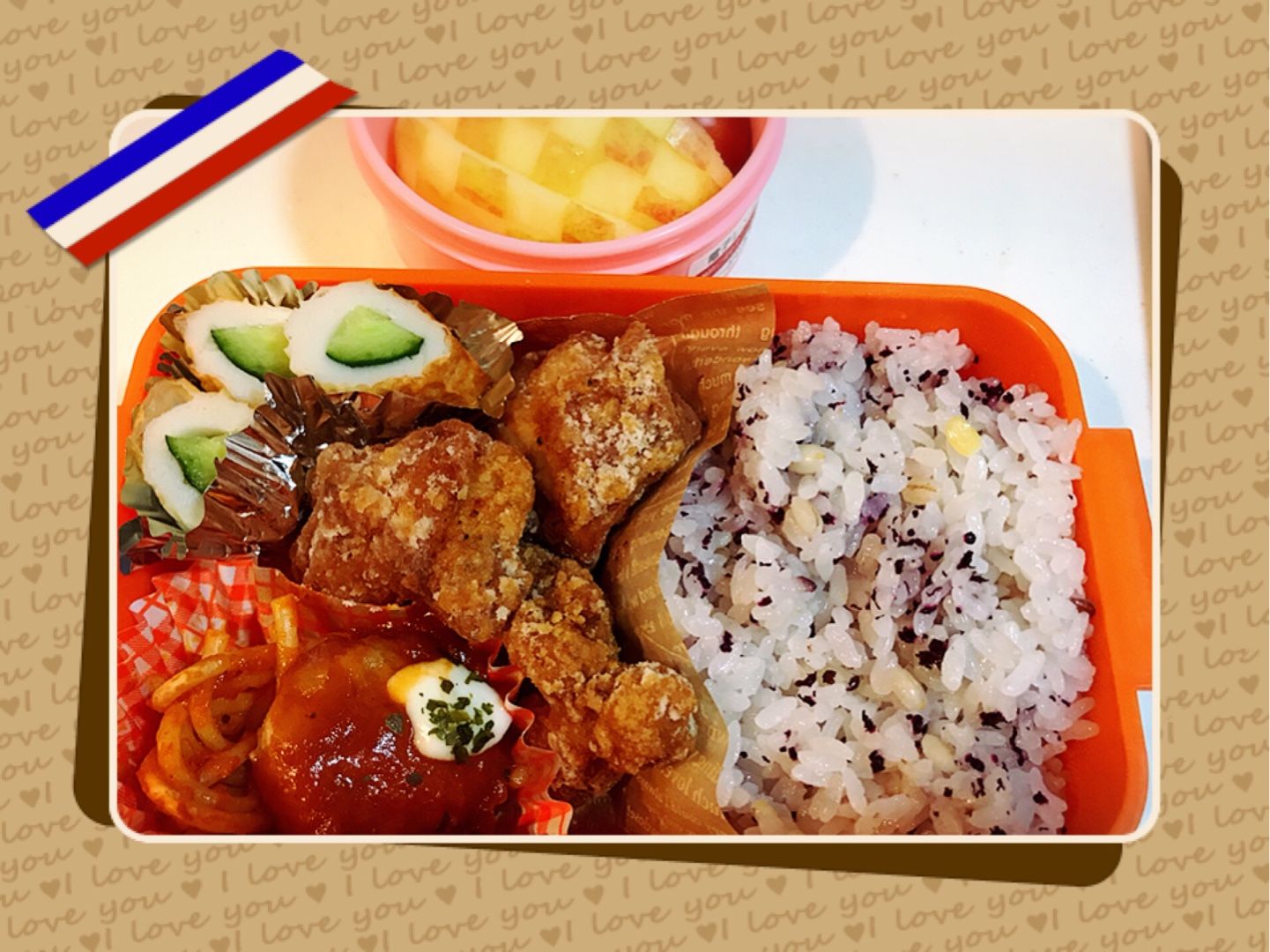 白身フライ弁当 きんぴらゴボウは自家製冷食 マカロニグラタンは市販の冷食です。 この日は、部活がないからおかずは少なめでというリクエストでした。 色々弁当 ナポリタン、甘酢団子 白身フライ、チキンカツ ちくわきゅうり きゅうりの色が悪いのは、ごま油と塩こぶであえたものを入れてるから。 これ、杏のお気に入りの箸休めです。