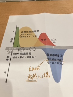 結論、最悪の血管肉腫という悪性のガンでした。すぐに抗がん剤治療を始めた方がいいです、と先生。正直、ショックすぎて先生の言葉が入ってこなかった。。。脾臓全摘手術を終え、元気なcocoの姿に絶対良性腫瘍だと信じていたのに、祈っていたのに、、、ガンはガンでも先生がこれだったら最悪です、と検査前に言っていた「血管肉腫」だなんて完治が難しく、抗がん剤治療をしても1年以上生きる子が10%満たないと調べたら書かれてた。先生も抗がん剤治療をしてのとりあえずの目標は半年です、と。え?一年もいきれない可能性が高いの?治療しても?人間でも抗がん剤治療は副作用がきついときくし、先生に「抗がん剤治療をしない方が楽だったりはしないんですか?」先生「しないですね、抗がん剤治療も副作用がきつければ薄めて副作用を極力少なくすむように調整しますし、抗がん剤治療をしない方が進行が速いガンなので、とてもしんどいと思います」となら、すぐに始めるしかない、ので、そのままその日に抗がん剤治療を始めることにしました。ゆっくり点滴で入れていくので、1時間お預かりします、と娘と近くのファミレスで待つことに。。。正直、食欲なんかない、けど、仕方なく食べる。やっと退院してほっとしてたのにまた病院においていかれるcoco。可哀相に。。。点滴はゆっくり1時間かけて入れていくらしい、その間注射針が抜けて液がこぼれたら皮膚が壊死するらしく、看護師さんが抱っこしてになるらしい。そりゃあお金かかっても仕方ないわな、てか、皮膚が壊死するような薬を体の中に入れるんだ、こわすぎる。。。副作用の説明で先生から渡された図まず、急性胃腸障害、その後、遅発性胃腸障害、それから下痢、同時期に骨髄抑制、さらに1週間後にまた骨髄抑制抗がん剤を入れるのは3週間に1回、その翌週に骨髄抑制の副作用が出ているかの検査、さらにその翌週にまた骨髄抑制の副作用が出ているかの検査、1回目のcocoの副作用は、全くありませんでした。下痢も吐き気もなし、血液検査の結果も問題なし、元気で、散歩にも行けました。けがには要注意ですが。あと4回同じ抗がん剤治療を行いますが、回を重ねればそれだけ心臓などに負担をかけるそう。もちろん、副作用も出てくるかも、一日でも長く元気でいて、苦しまずにいてほしい。望むのはそれだけ。もちろん、長生きしてほしいけど、それこそ、20歳ぐらいまで生きてほしかったし、でも、もうそんな贅沢なことはいえないから、できるだけ一緒にいてあげるために仕事もやめることにしました。抗がん剤治療、とってもお金もかかるので、仕事やめることに不安はあります、もちろん。在宅ワークを探してるけど、これまたなかなか受からず、書類選考で落とされてばかり、だけど・・・後悔したくないからね精一杯のことをしてあげよう✨