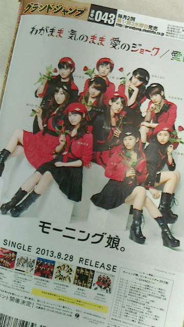 昨日の反省。太田さんはいっそんの方が合っていそう。月曜放送のあまちゃんやはりネットではミズタク祭りで盛り上がっていた模様。るぴゃ~んしゃ~んしぇ~い NHK「LIFE」、レギュラーらしからぬ放送形態クドカンゲストのコントは最高に面白かったデス。ウッチャン・・・ やっぱり好きデス。そして麺好きダンナ様が好きな西田尚美が麺好きですた。どうでもいい情報すぎて、教えてあげませんでした。 今朝はプラスチック容器ゴミの日でした。相変わらず車でゴミ出し。マジでどうにかしてほしい。同じこと思ってる人はゴマンといるようで、地域の市民フォーラムだかなんだかで集積所問題が出てましたけど回答は「自治会通して申請せよ」だから!そんなこと言ってたら誰も設置を声高に訴えられないんだってば!もう、半強制的に「隣保班1つにつき1ヶ所設置しましょう」とか決めてくんないと。マジで年取った時のことが心配。 ゴミ出しついでに寄ったコンビニでグランドジャンプ買ったら裏表紙がモー娘。さん達で、つい「オッ」と声が出てしまいました。もはや親心。