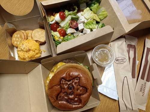 家で食べました。サラダは美味しかった。ハンバーガーはバンズがかためでした。万博値段は致し方なし