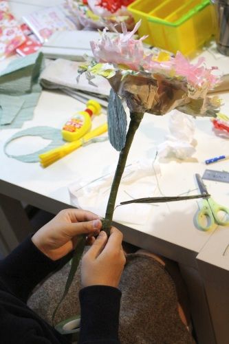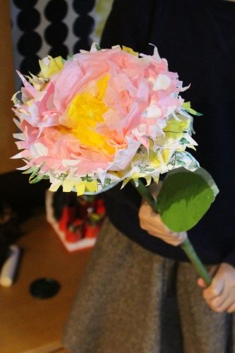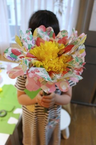 母の日が近いこともあり、花を作ることにしました。ペーパーナプキンとお花紙を使って、花飾りを作る要領で作ります。