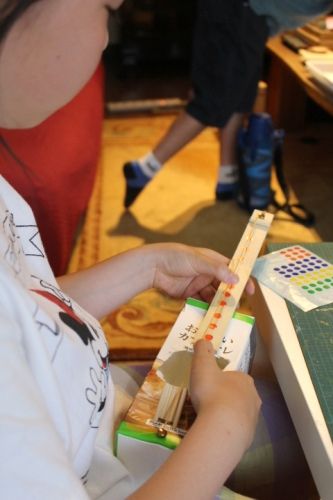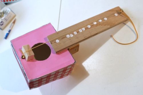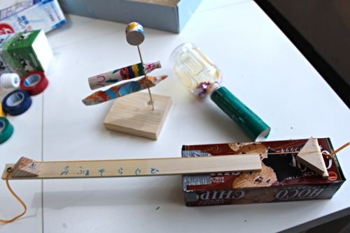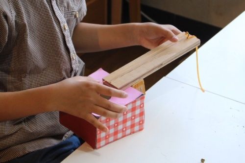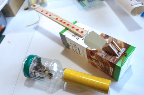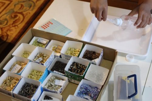 マラカスづくりです。ボトルの中に入れるものをあれこれと試しています。