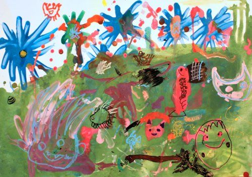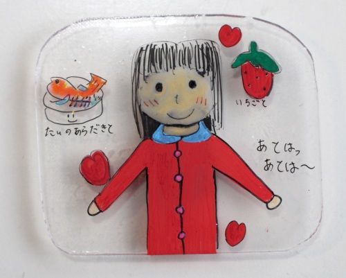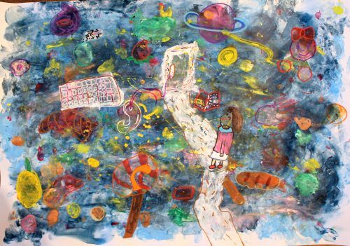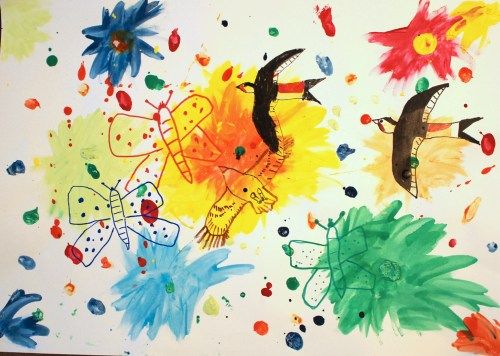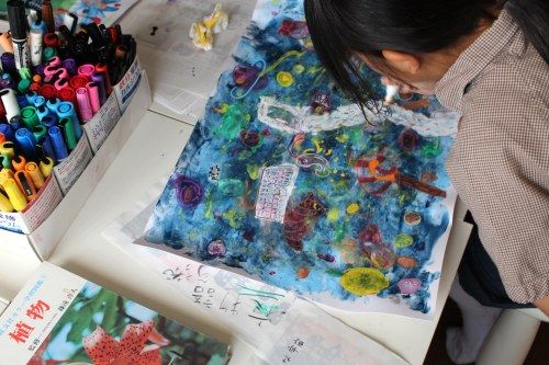 前回指で着色した画用紙に自由に絵を描いてもらいました。思いつきにくい人は図鑑を参考にしてもいいです。タイトルもつけました。