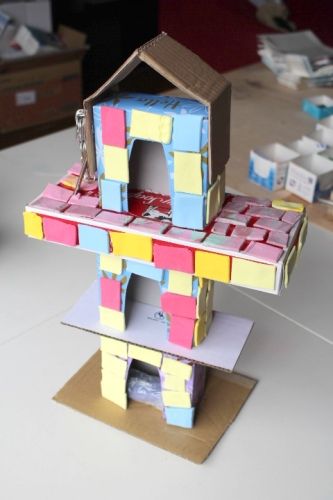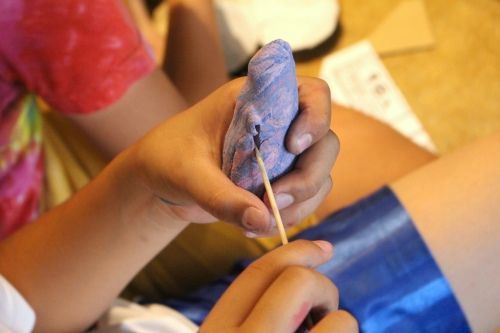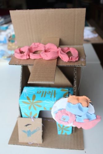 こんな表現ができます。型抜きには向きませんが、感触が面白いので子どもたちも面白がっています。普通の軽い紙粘土と混ぜたり、絵の具を混ぜたりすると固くなってしまうので、そのまま使うのが無難です。子どもたちがいろいろと実験してくれました。
