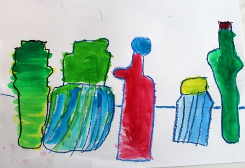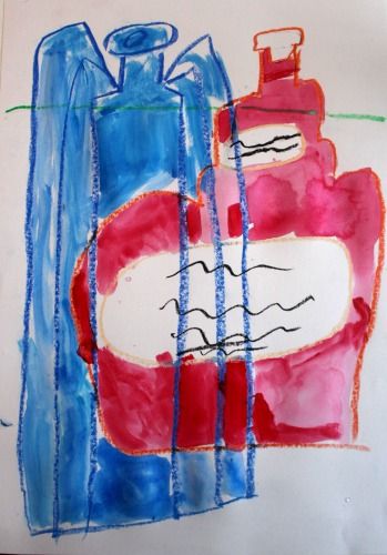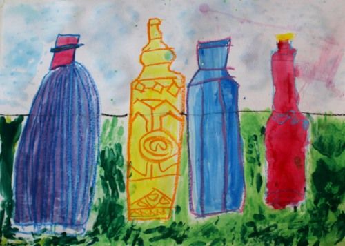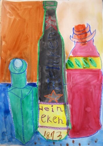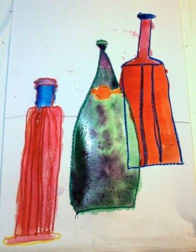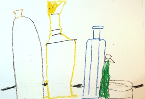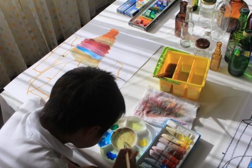 部屋に午後の陽射しが深く入るようになってきました。今日はいろんな形の瓶を描き分けて、色彩構成をします。瓶が作る影も鑑賞します。