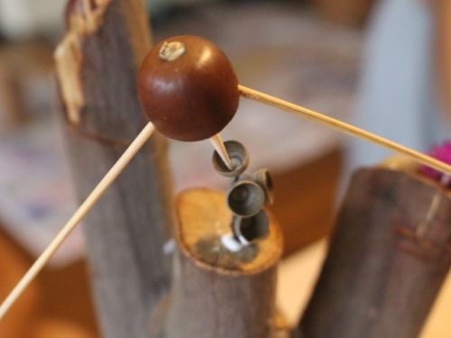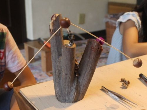 「ビン」の絵が完成した人からクヌギでやじろべえを作りました。「やじろべえ」作るよ~って言うと、みんなキョトンとしちゃって、しばらくしてから「何ですか?」と聞かれ…