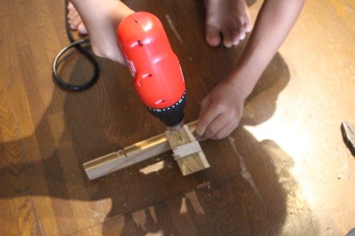 やじろべえも面白いけど、電動ドリルの方に興味がいっちゃう子もいて、そこいらに転がってる廃材に片っ端から穴を開けています。心配でずっと貼りついてました。