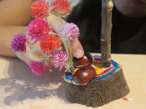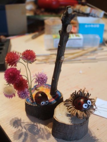 こちらもやじろべえよりも、クヌギのてんとう虫作りに没頭中。半分にカットしてマジックで着色してます。お花は今満開のセンニチコウをドライにしたもの。家で育てています。