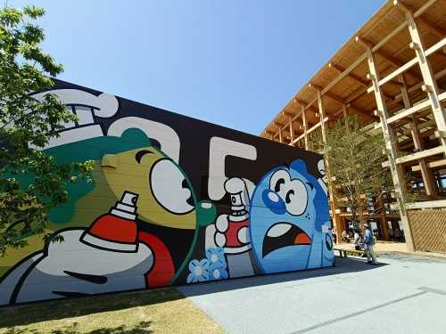 レイガーデンに向かいます。今日は赤十字のスペシャルデーで高校生のブラスバンド演奏が聴けるらしいので、席を取りに行きます。途中にあった壁画はアーティストCOOKの「WORD EXPO 2025」