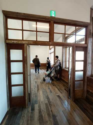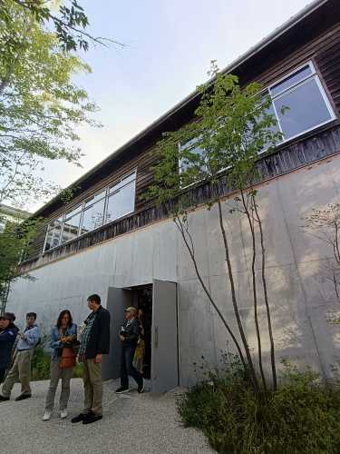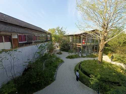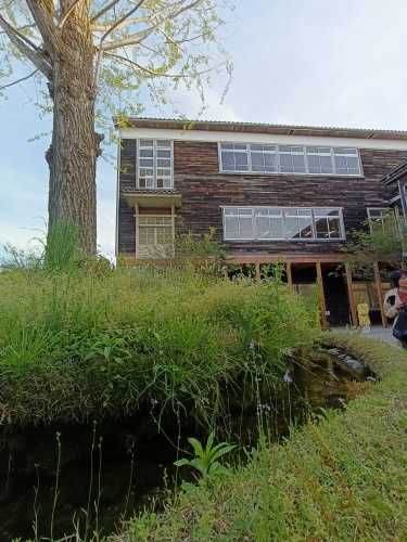 シアターから出てきたところ。コンクリートの構造物の上に移築された木造校舎が乗っている難しい造り。