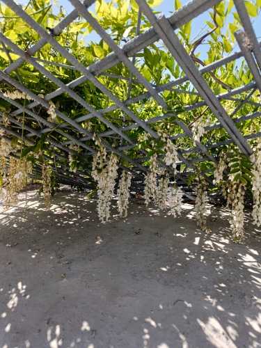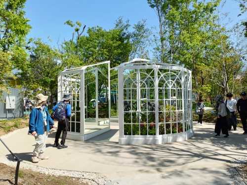 ここの休憩所のパーゴラには藤がまとわりついている。ここは静けさの森に近いし、閉幕後も残るのかもしれない。