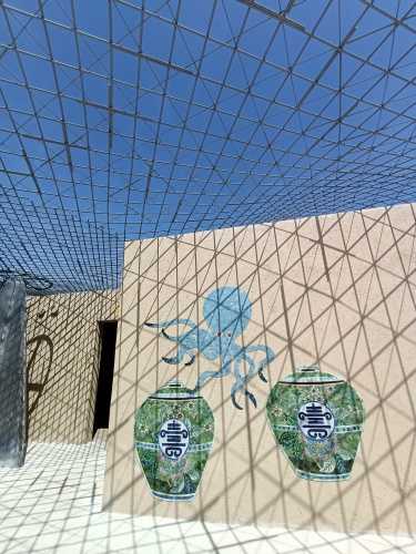 土壁にモザイクの絵。ミヤマケイ「水心」大阪といえばタコ。末広がりの八本足の八は縁起の良い数字。未来が末広がりに良い方向に行くように願った作品となっている。