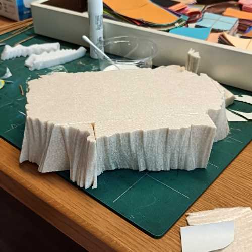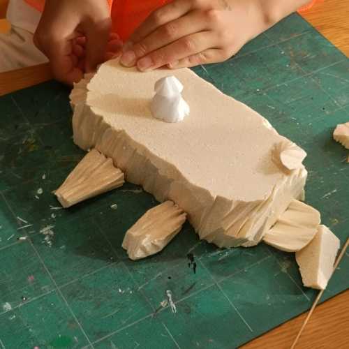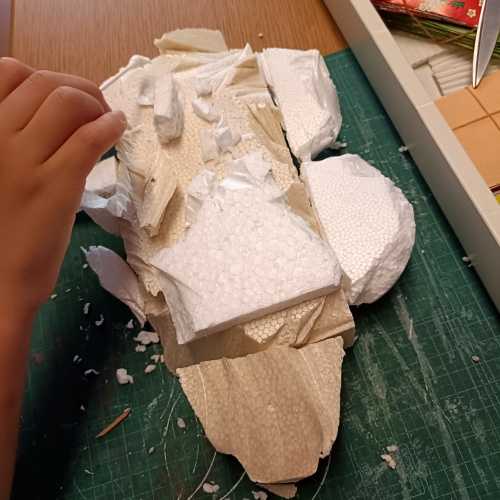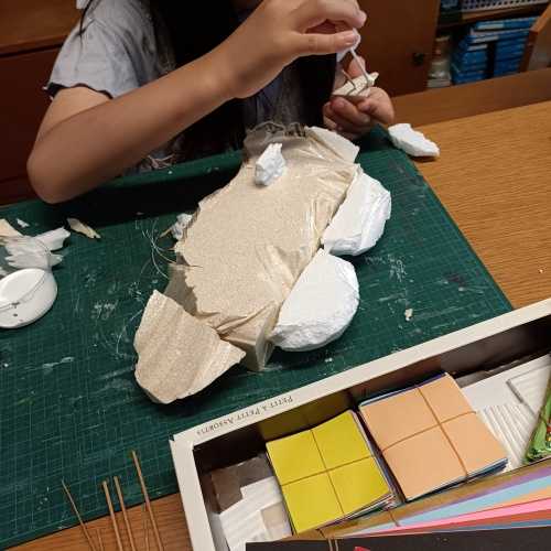 今日は土台作りです。レンガ大の発砲スチロール(ダイソーで購入)を自由にカットして海底を作ります。熱線カッターで切るだけでも、結構個性がでますね。この道具はやけどの危険もありますので、一台だけ用意して見守ります。ほかの人はその間、生き物を作っています。