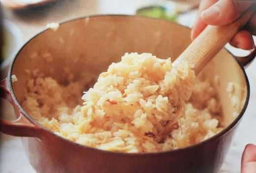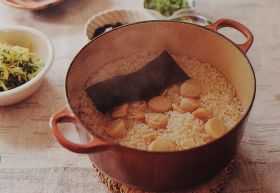 鍋に米、 昆布うすくちしょうゆなど入り水分、塩、ホタテの身を入れて火にかける。