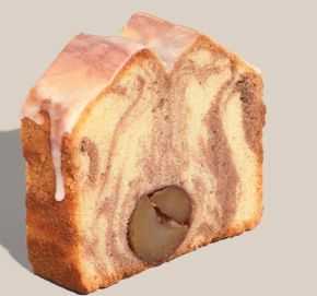 「しっとりした食感にこだわったプレーン生地とペースト状にした甘栗を加えたマロン生地をマーブル状に仕上げ、中心に栗の甘露煮を入れています」とのこと。中心に鎮座する見事な栗の甘露煮。 これはなかなか当たりのカットかも?