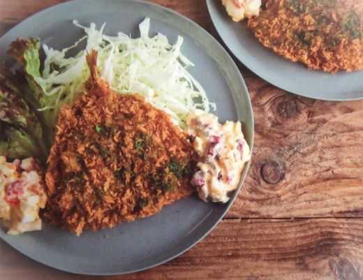 梅かつおとしば漬けの和風タルタルソースでさっぱりと・‣……